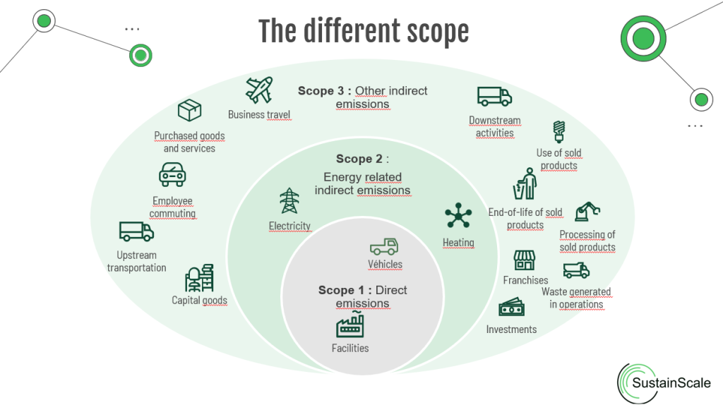 • Scope 1: Les émissions de portée 1 correspondent aux émissions directes de l’entreprise, c'est-à-dire les émissions liées aux bâtiments et véhicules de l’entreprise.